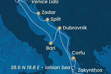 Benátky - Bari (Itálie) - Santorini (Řecko) - Mykonos (Řecko) - Katakolon / Olympia (Řecko) - Benátky - Bari (Itálie) - Korfu (Řecko) - ZAKYNTHOS - Argostoli/Kefallinia (Řecko) - Dubrovník - Split (Chorvatsko) - Benátky. Loď patří do flotily Italské plavební společnost…
