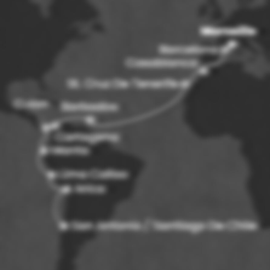Marseille (Francie) - Barcelona (Španělsko) - Casablanca (Maroko) - St. Cruz de Tenerife (Španělsko) - Barbados (Nizozemské Antily) - Cartagena (Kolumbie) - Colon (Panama) - MANTA (Ekvádor) - MANTA (Ekvádor) - Lima Callao - Arica (Chile) - San Antonio (Chile).